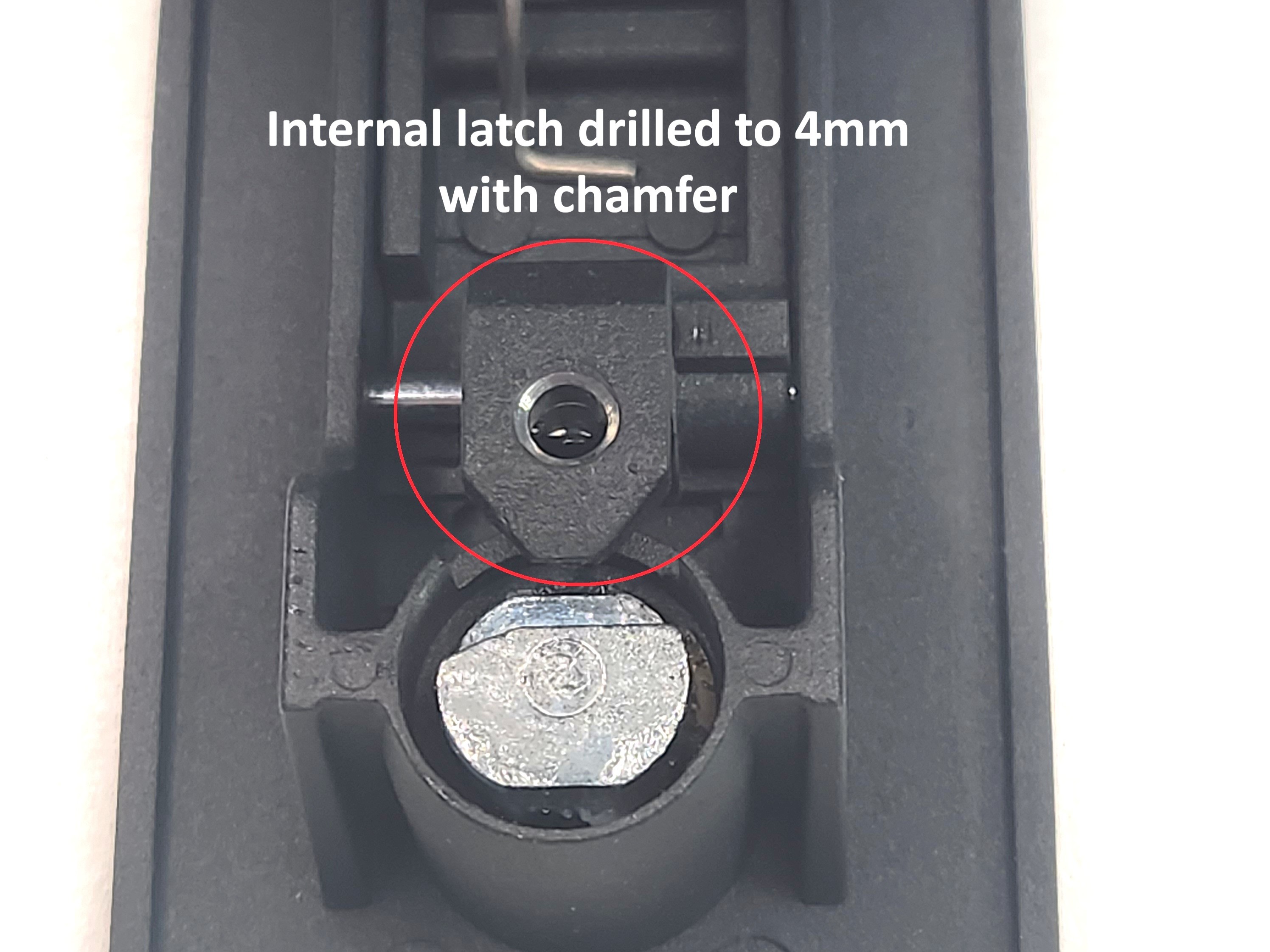 4. With handle in the closed position and locked with the key (this is so the internal latch doesn`t move when drilling) hold the handle in a drill press (I used a rag on the drill press so not to scratch the handle). Drill the 3 holes through the template and handle body with a 1.5mm drill. This will ensure the hole centres are accurate. The centre hole must also be drilled through the internal locking latch, (approx. 11mm deep from the top of the handle body). Then remove the template and drill the 3 holes as shown in picture 2, (2 x 3mm & 1 x 3.5mm). Holes must be at 90 deg to handle body. Picture 3. Drill the 3.5mm hole through handle body and the internal locking latch, (approx. 11mm deep from the top of the handle body). Then unlock the handle and open it, then use the key to put the barrel back to the lock position, and drill the internal latch hole out to 4mm, do not drill the handle body with the 4mm drill or go any bigger than 4mm in the internal latch, or the adaptor will not work. Put a small chamfer on top of the 4 mm hole. Picture 4. Ensure all burs and swarf is removed from inside the handle. Put the barrel back into the unlock position.
