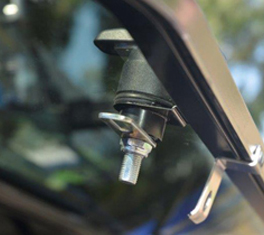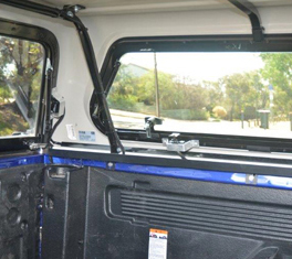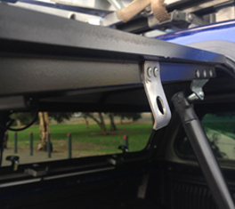 - Open side window. Select location for side window bracket (close to handle but leave enough room so as not to interfere with movement of the handle, and making allowance for the protection bracket to be installed). Drill two holes through the bracket and into the window frame with a 3.5mm pop rivet drill. (Be careful not to hit the window glass with the drill as this may shatter the glass) Using the pop rivets supplied install the bracket onto the underside of the window frame.