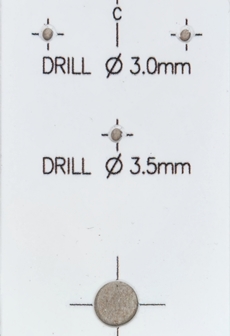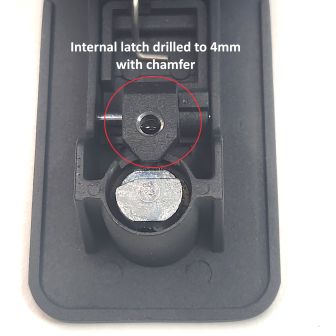4. With handle in the closed position and locked with the key (this is so the internal latch doesn`t move when drilling) hold the handle in a drill press (I used a rag on the drill press so not to scratch the handle). Drill the 3 holes through the template and handle body with a 1.5mm drill. This will ensure the hole centres are accurate. The centre hole must also be drilled through the internal locking latch. (approx. 11mm deep from the top of the handle body). Then remove the template and drill the 3 holes as shown in picture 2, (2 x 3mm & 1 x 3.5mm). Holes must be at 90 deg to handle body. Picture 3. Drill the 3.5mm hole through handle body and the internal locking latch, (approx. 11mm deep from the top of the handle body). Then unlock the handle and open it, then use the key to put the barrel back to the lock position, and drill the internal latch hole out to 4mm, do not drill the handle body with the 4mm drill or go any bigger than 4mm in the internal latch, or the adaptor will not work. Put a small chamfer on top of the 4 mm hole. Picture 4. Ensure all burs and swarf is removed from inside the handle. Put the barrel back into the unlock position.
