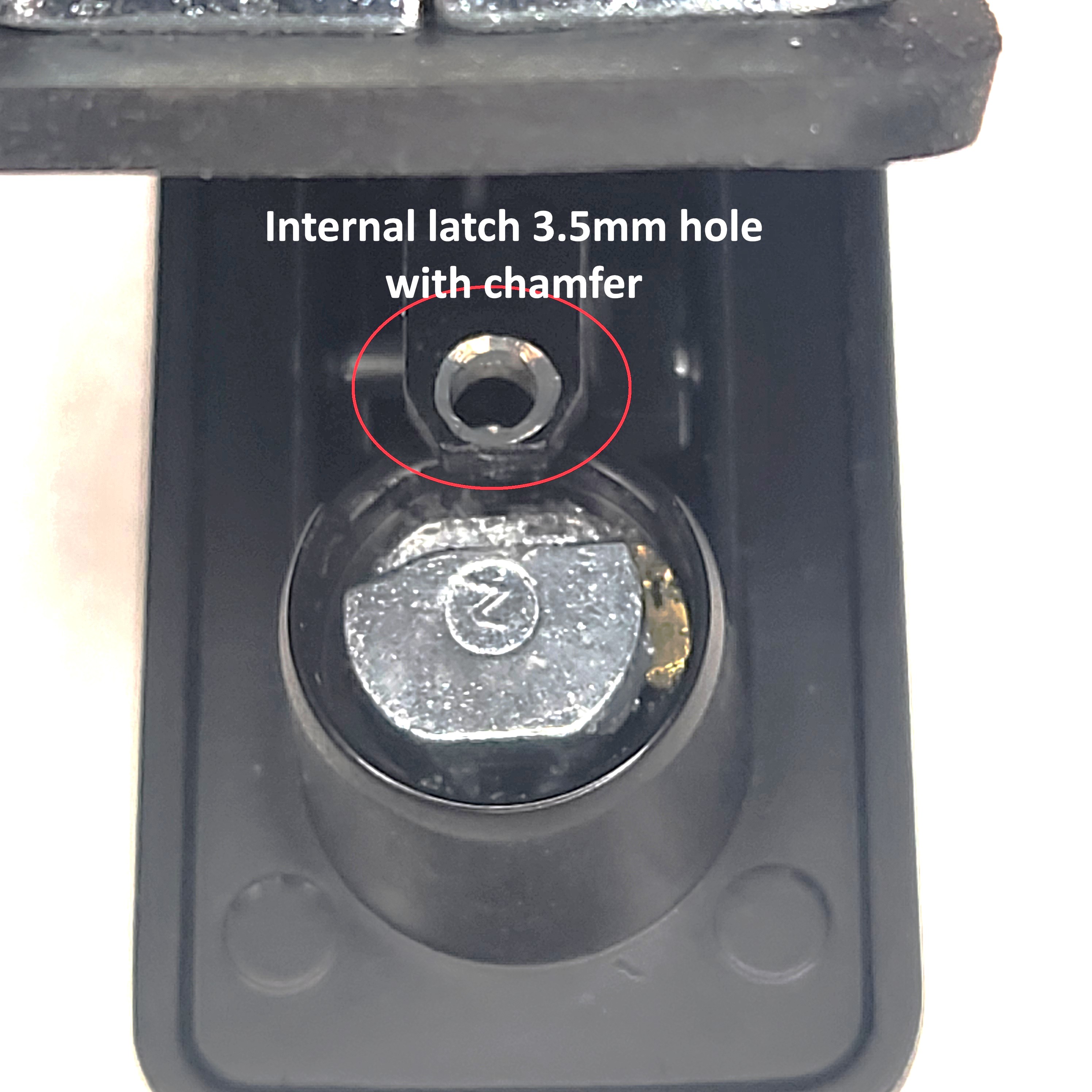 3. With handle in the closed position and locked with the key (this is so the internal latch doesn`t move when drilling) hold the handle in a drill press (I used a rag on the drill press so not to scratch the handle). Drill the 3 holes through the template and handle body with a 1.5mm drill. This is to ensure the hole centres are accurate. The centre hole must also be drilled through the internal locking latch. (approx. 111mm deep from the top of the handle body). Then remove the template and drill the 3 holes as shown in picture 2, (2 x 3mm & 1 x 3.5mm). Holes must be at 90 deg to handle body, picture 3. Drill the 3.5mm hole through handle body and the internal locking latch, (approx. 11mm deep from the top of the handle body). and add a small chamfer to top of the hole drilled in the internal latch. Picture 4. Ensure all burs and swarf is removed from inside the handle.